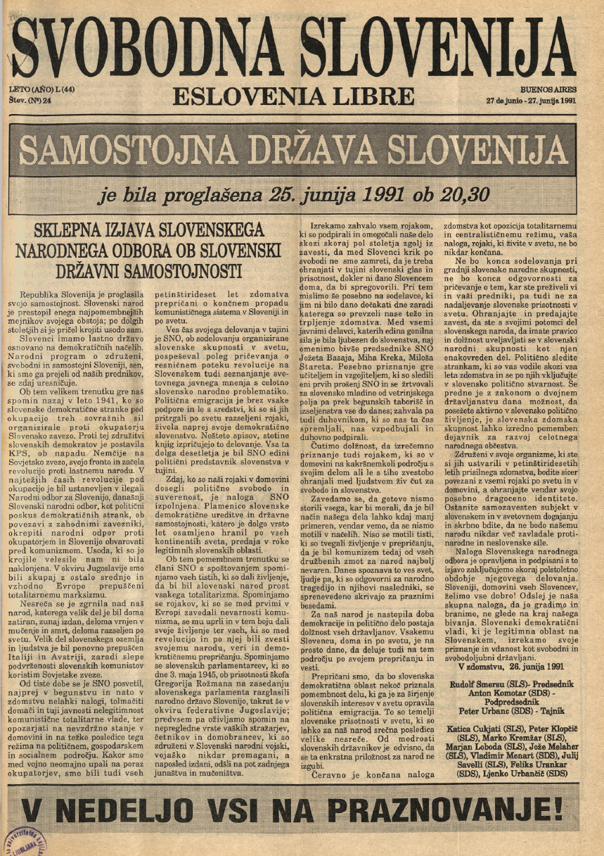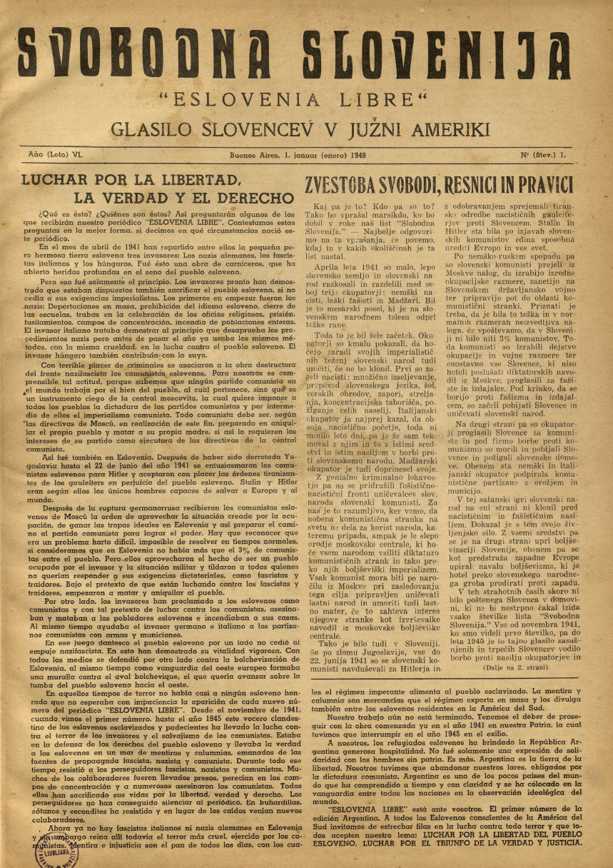 “Svobodna Slovenija” je pred Vami. Prva številka v argentinski izdaji. Vse poštene Slovence v Južni Ameriki pozivamo, da se pridružijo naši borbi proti vsakemu nasilju in da vsi sprejmejo naše geslo: “Borba za svobodo slovenskega naroda, borba za zmago resnice in pravice!”