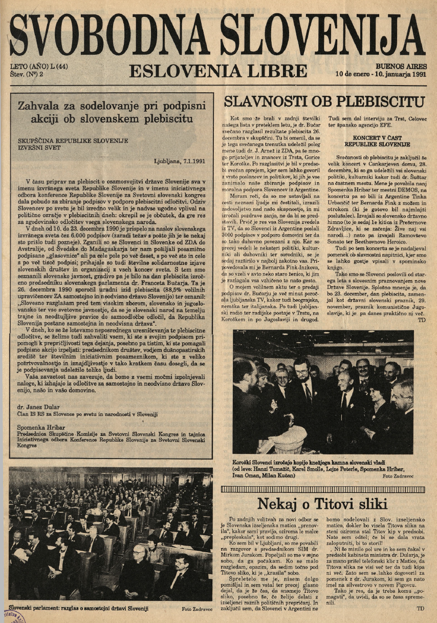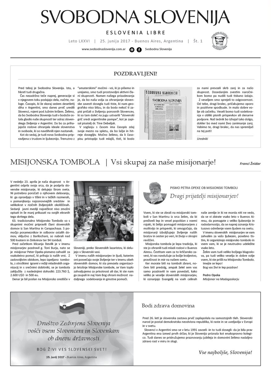 Letos naše glasilo Svobodna Slovenija praznuje 85-letnico obstoja. Prva številka je izšla kot ilegalni list v Sloveniji 22. novembra 1941 s pozivom vsem Slovencem k enotnosti in medsebojni duhovni povezanosti v boju proti fašizmu, nacizmu in komunizmu. V ilegali je izhajala v Sloveniji do leta 1945, od leta 1948 pa redno izhaja v Argentini. Poleg časopisa je Svobodna Slovenija izdala tudi knjige in zbornike.
