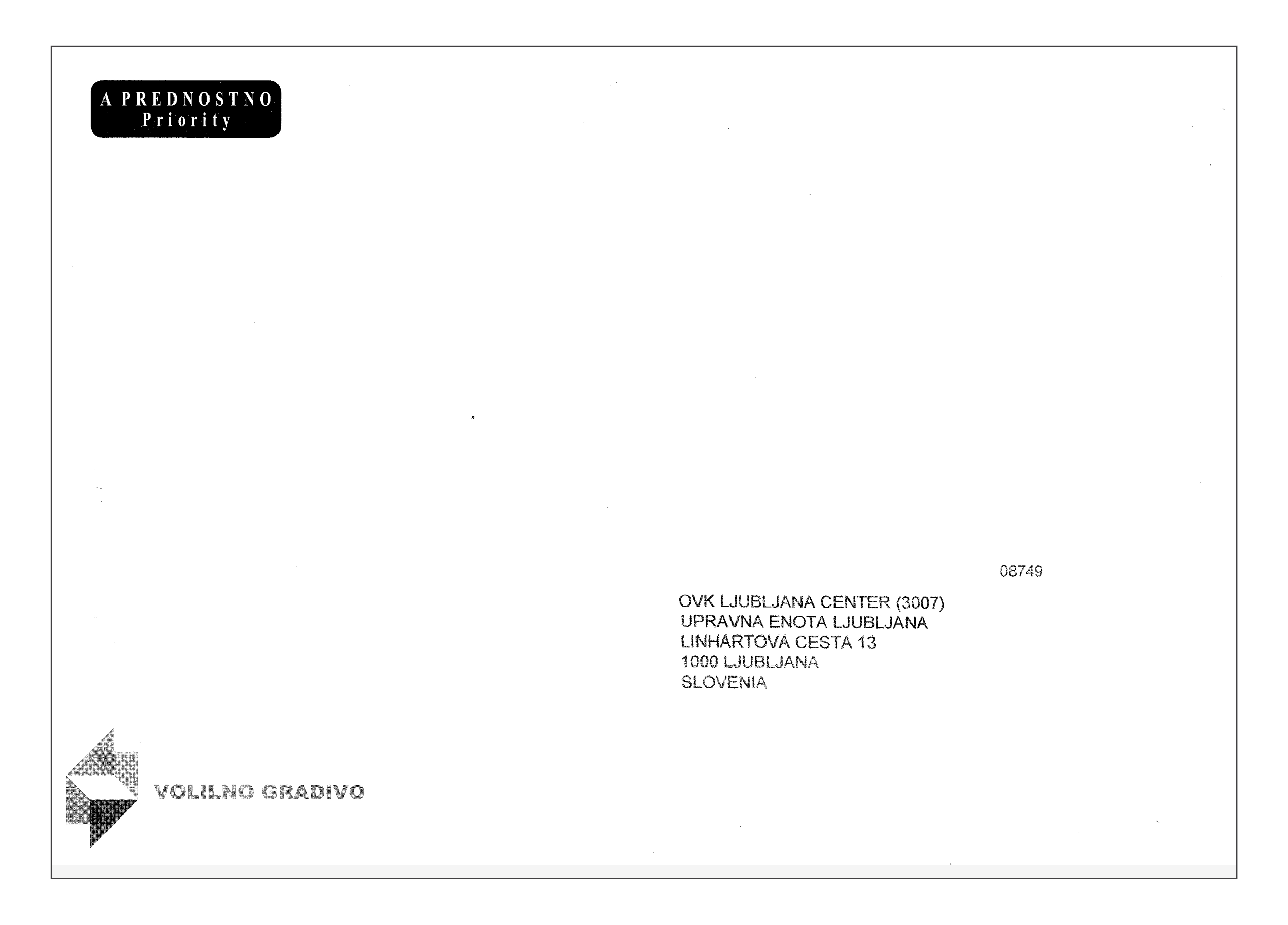 Adjunte al sobre pequeño la tarjeta electoral firmada y coloque ambos en el sobre grande que dice »Za gradivo« y que contiene la dirección del distrito electoral que recibirá su voto. Pegue la solapa del sobre.