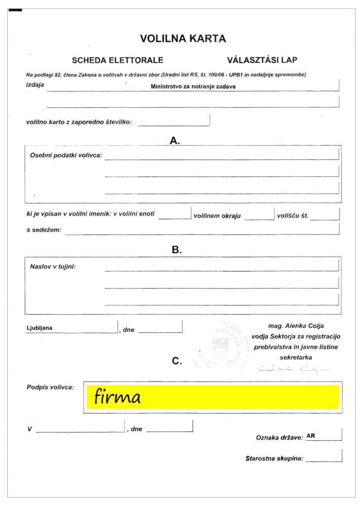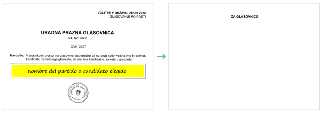 Todos los eslovenos residentes en el exterior reciben por correo una boleta en blanco, una tarjeta de votación, una hoja con instrucciones y dos sobres.