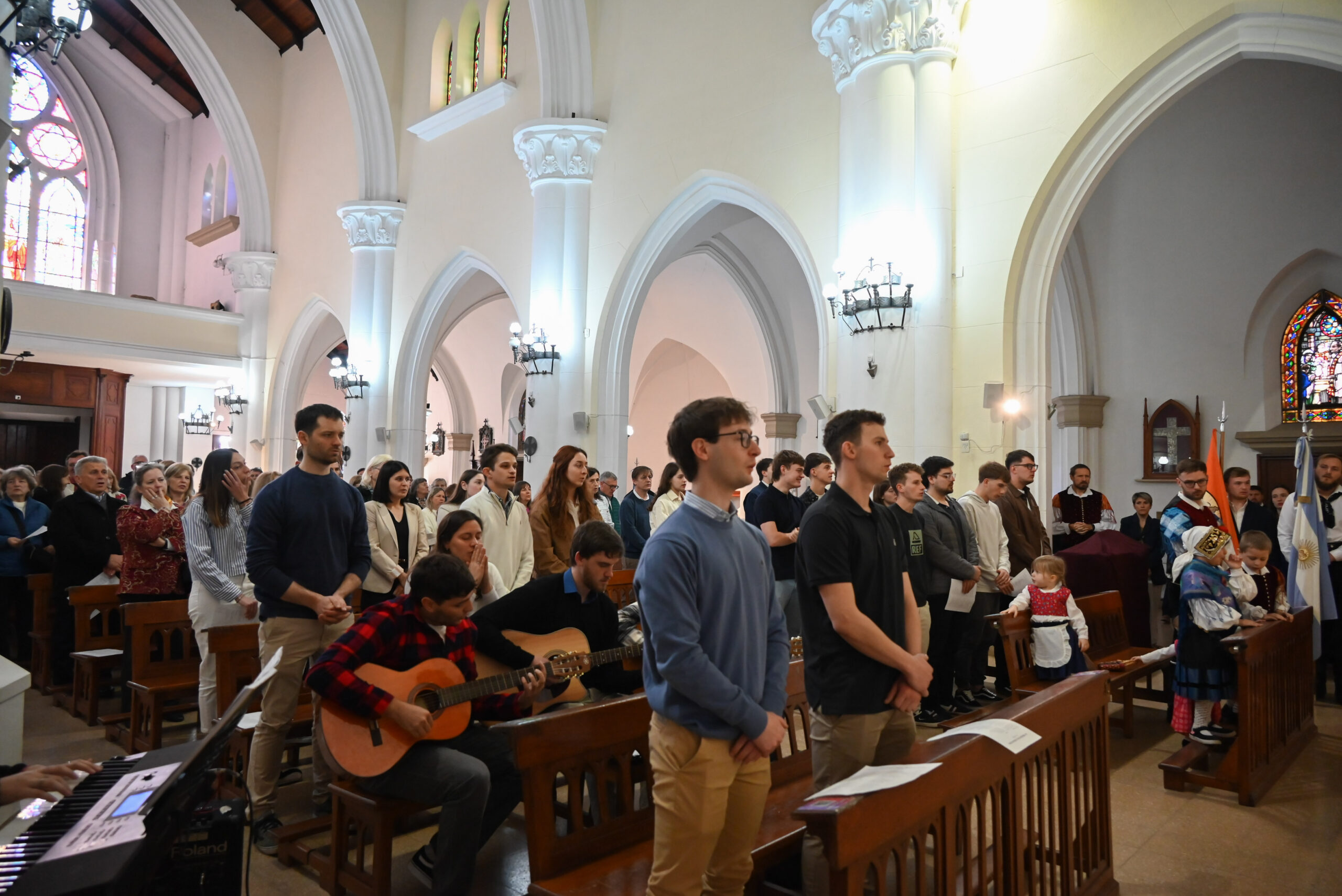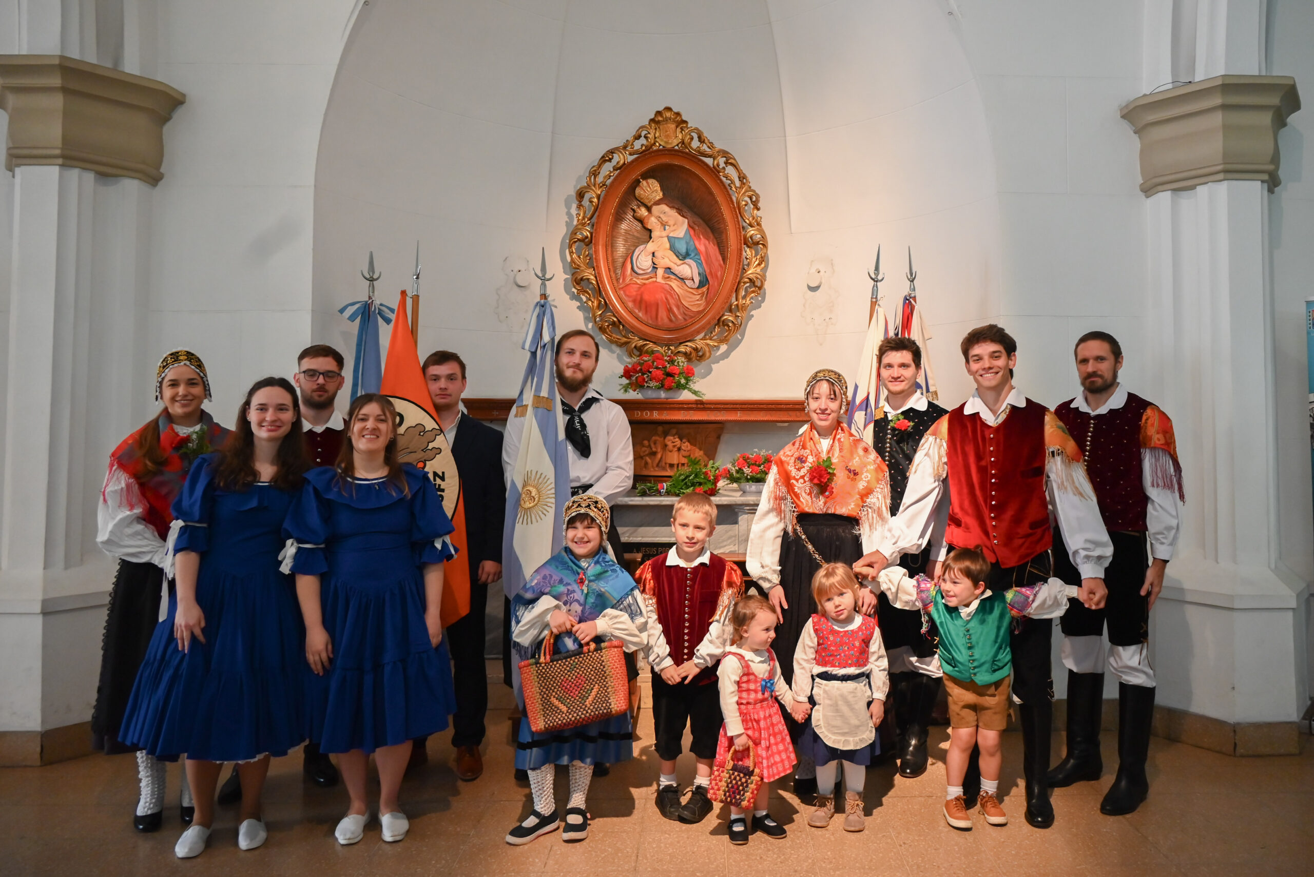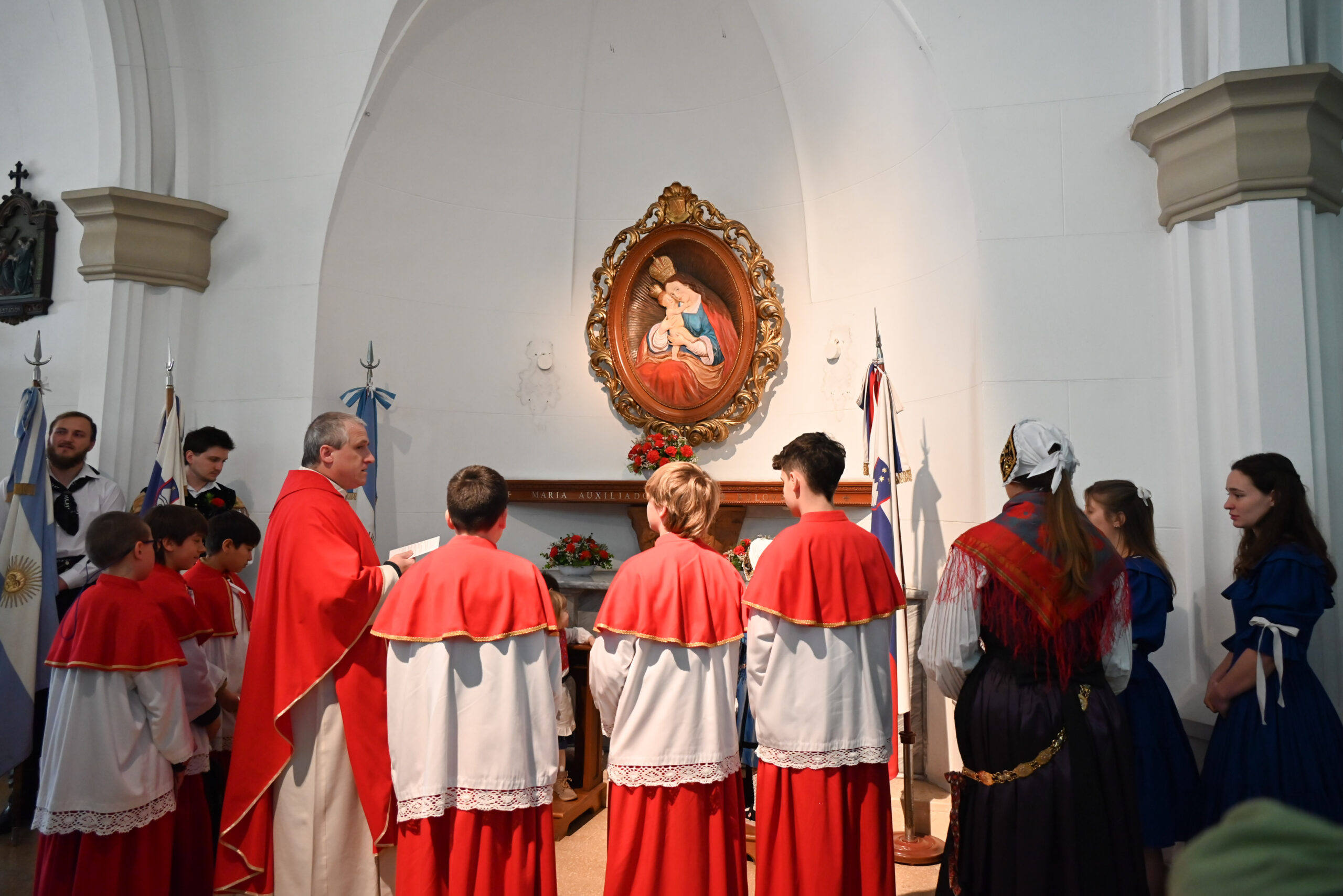 V nedeljo, 14. septembra, smo se zbrali v sanhuški stolnici, da bi pričeli naš dan s sveto daritvijo, pri kateri smo se zahvalili Gospodu za dar mladosti, za naše družine in za slovensko skupnost. Sveto mašo je daroval gospod Robert Brest. Mladi in vsi navzoči smo počastili našega nebeškega Očeta z molitvijo in petjem. Prisotne so bile tudi zastave in narodne noše naših dveh domovin. Na ta poseben dan smo približali razne darove pred oltar: starši so prinesli kruh in vino, kot simbol vseh dobrot, vzgoje in vrednot, ki so nam jih posredovali, otroci pa žogo, športno majico in šopek rož, v znamenje vztrajnosti in združenega dela za bodoči rod. Sveta maša se je zaključila pred Marijino podobo. Obrnili smo se k njej in ji izročili svoje prošnje in zahvale.