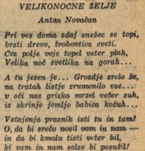 Viri: Svobodna Slovenija, Zbornik Svobodne Slovenije, Meddobje, Antologija slovenskega zdomskega pesništva (SKA 1980), Milan Pugelj, Anton Novačan, Cvetko Golar – Izbrano delo (Mladinska knjiga, 1971), Anton Novačan – Izbrano delo (Založba Obzorja, 1993)