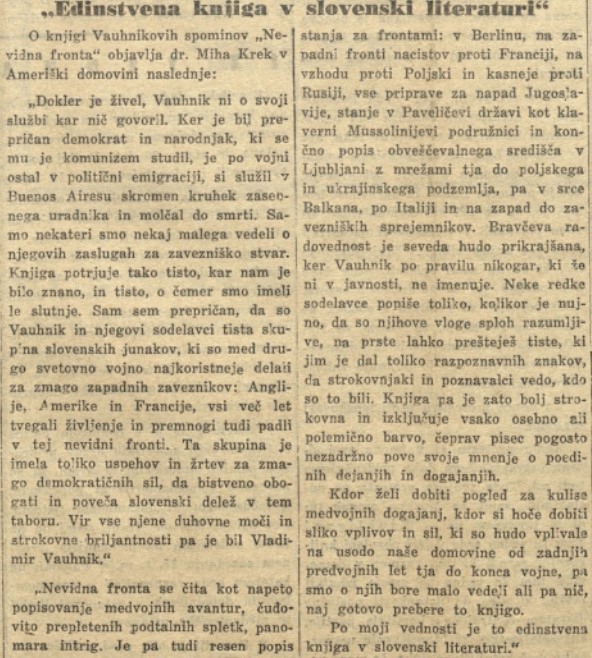 O knjigi Vauhnikovih spominov “Nevidna fronta” objavlja dr. Miha Krek v Ameriški domovini naslednje: