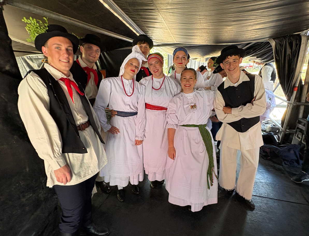 Nedelja je bila najbolj intenziven dan. V vročem popoldnevu smo sodelovali v celotnem sprevodu, ki se je začel ob 16. uri, zvečer ob 19. uri pa smo ponovno nastopili na odru, tokrat v čarobni svetlobi sončnega zahoda. Po končanem programu smo ostali na prizorišču do poznih večernih ur ter uživali v sproščenem druženju med stojnicami in ob ogledu nastopov drugih folklornih in glasbenih skupin.