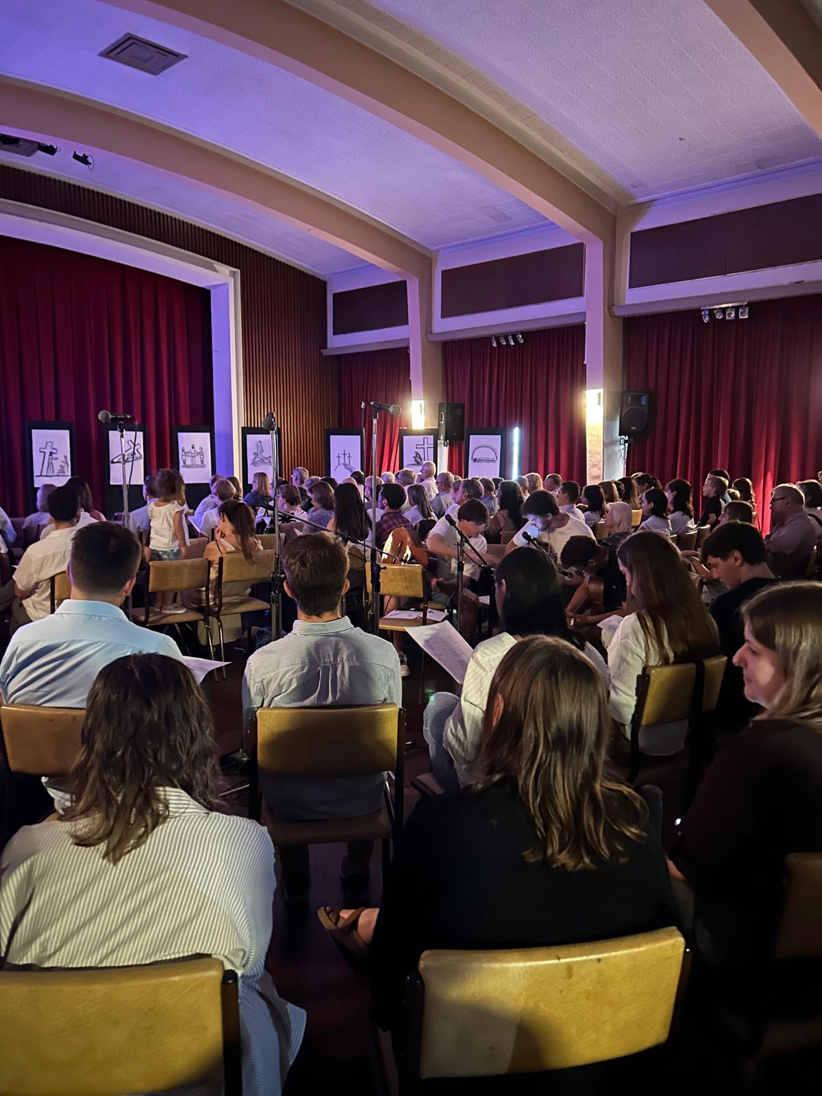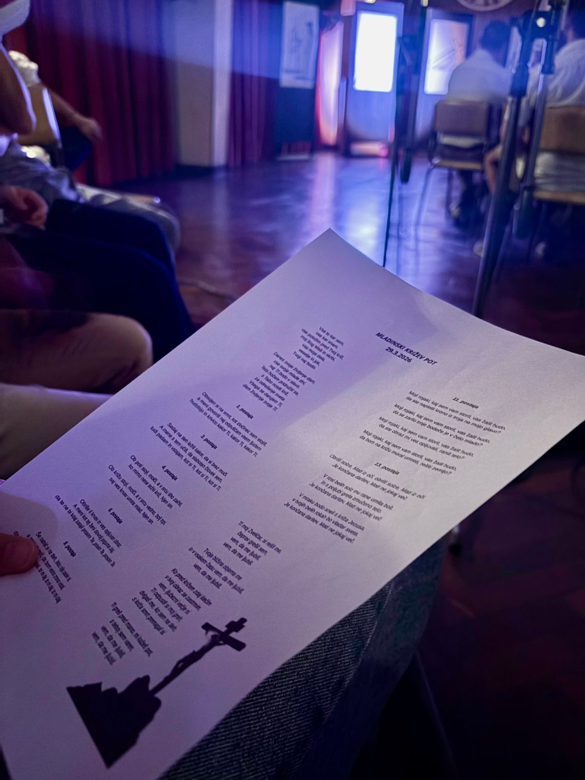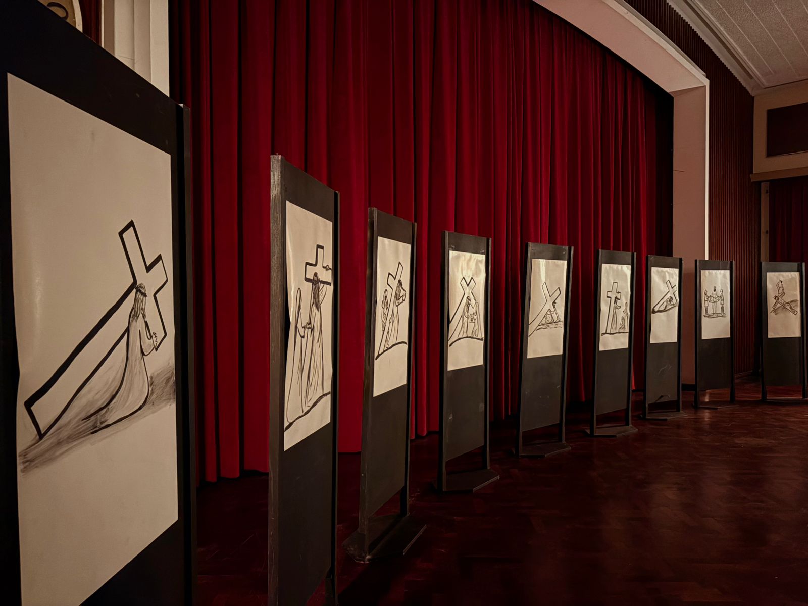 V dvorani so bile pred vsemi narisane podobe štirinajstih postaj, ki so nam pomagale premišljevati posamezne postaje ter nas navdihovale, da bi živeli po tem, kar nas je učil Jezus Kristus: »Če hoče kdo hoditi za menoj, naj se odpove sebi, vzame svoj križ in hodi za menoj«.
