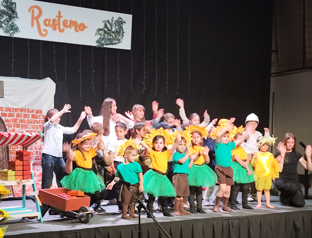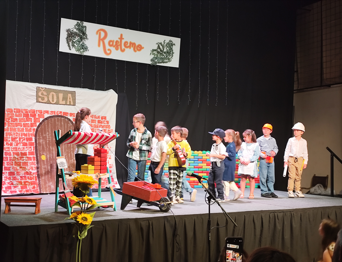 Na koncu so se vsi razredi ponovno zbrali na odru. Poklici, vrednote, cvetje in sončnice so se povezali v eno samo podobo. Skupaj so zapeli pesem »Rastemo« in za trenutek je bil oder videti kot velik vrt: barve, pogledi, glasovi, prepleteni v eno. Kajti odraščanje je tudi to: združevanje, da nastane nekaj večjega od nas samih, kot mnogo zidakov, ki skupaj postavijo dom.