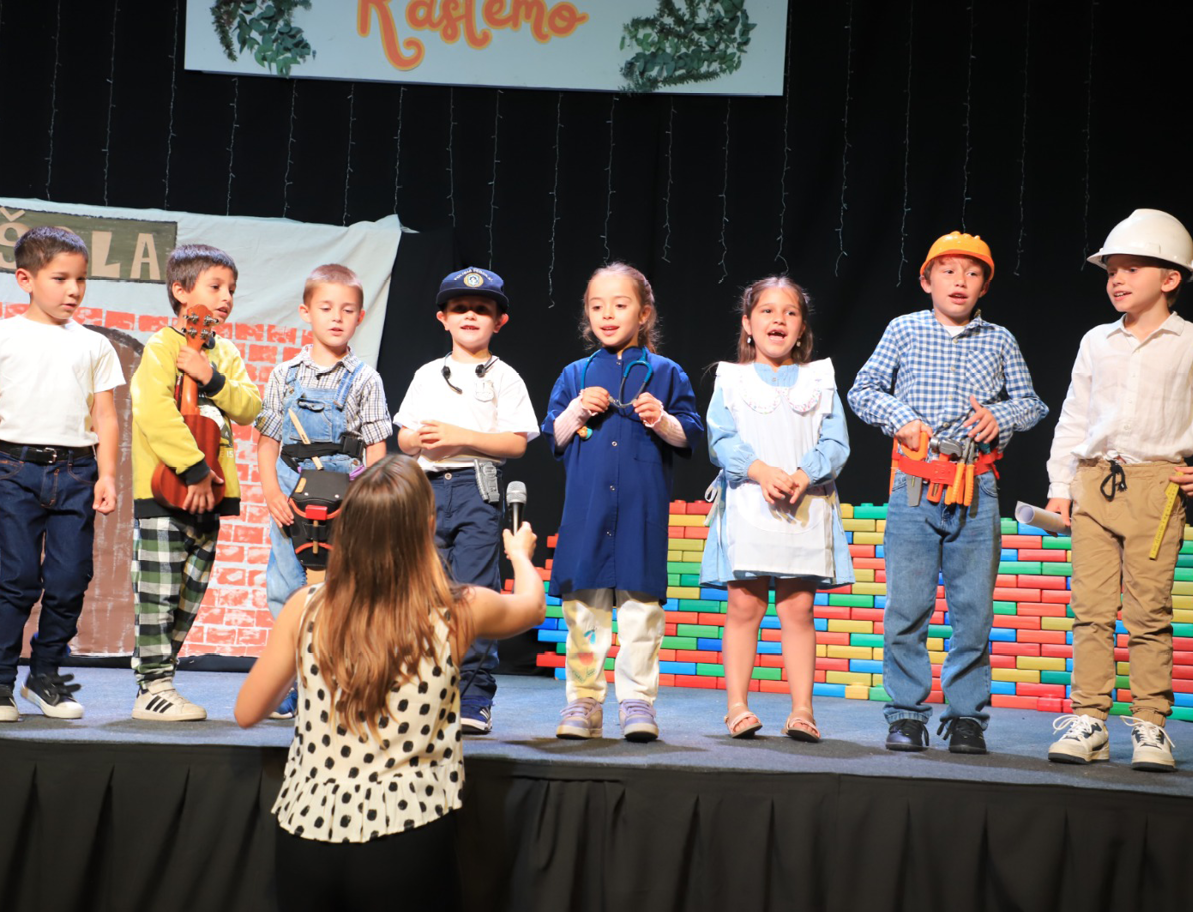 Nastopili so učenci 1., 2. in 3. razreda. V pisanih kostumih so se igrali z vprašanjem: »Kaj bom, ko bom velik?« Tukaj gasilec, tam zdravnica, glasbenik, mizar, gradbenik, učiteljica, prodajalec, policist … Njihovi glasovi so gradili sanje kot barviti zidaki.