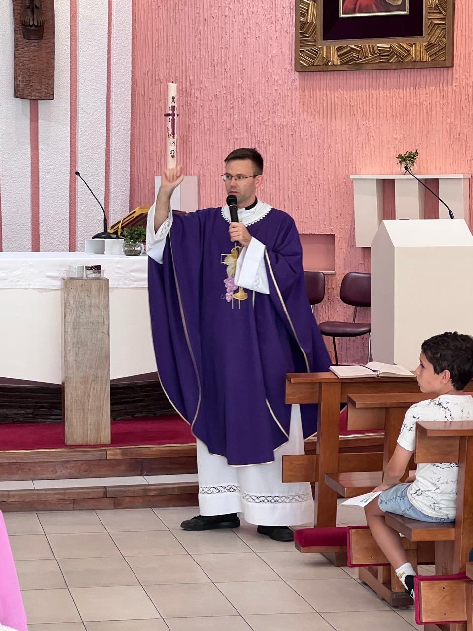 Mašo je daroval g. Gašper Mauko, ki nam je zelo lepo razložil evangelij. Nihče ni pričakoval, da bo začel tako: bili sta dve skodelici na mizici in je vprašal: “Če bi vam ponudil vodo, katero skodelico bi izbrali?” Vsi smo enoglasno – odrasli in otroci – odgovorili: “Ta čisto!”, saj je ena skodelica bila zelo umazana. Gospod Gašper je potem razložil, kako sta se videla od zunaj farizej in cestninar. Kako se je farizej kazal po templju, da ni kakor drugi, cestninar pa je vedel, da je grešnik in je molčeče prosil Gospoda za milost in usmiljenje.